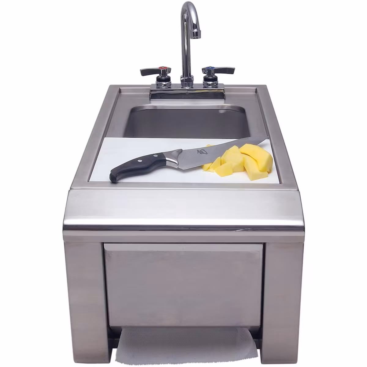 This Alfresco Prep and Wash Sink features a commercial grade stainless steel sink with hot and cold faucet, commercial-style poly cutting board, and integrated c-fold towel dispenser. Stamped with the Alfresco logo, you can be assured you are receiving high quality equipment.