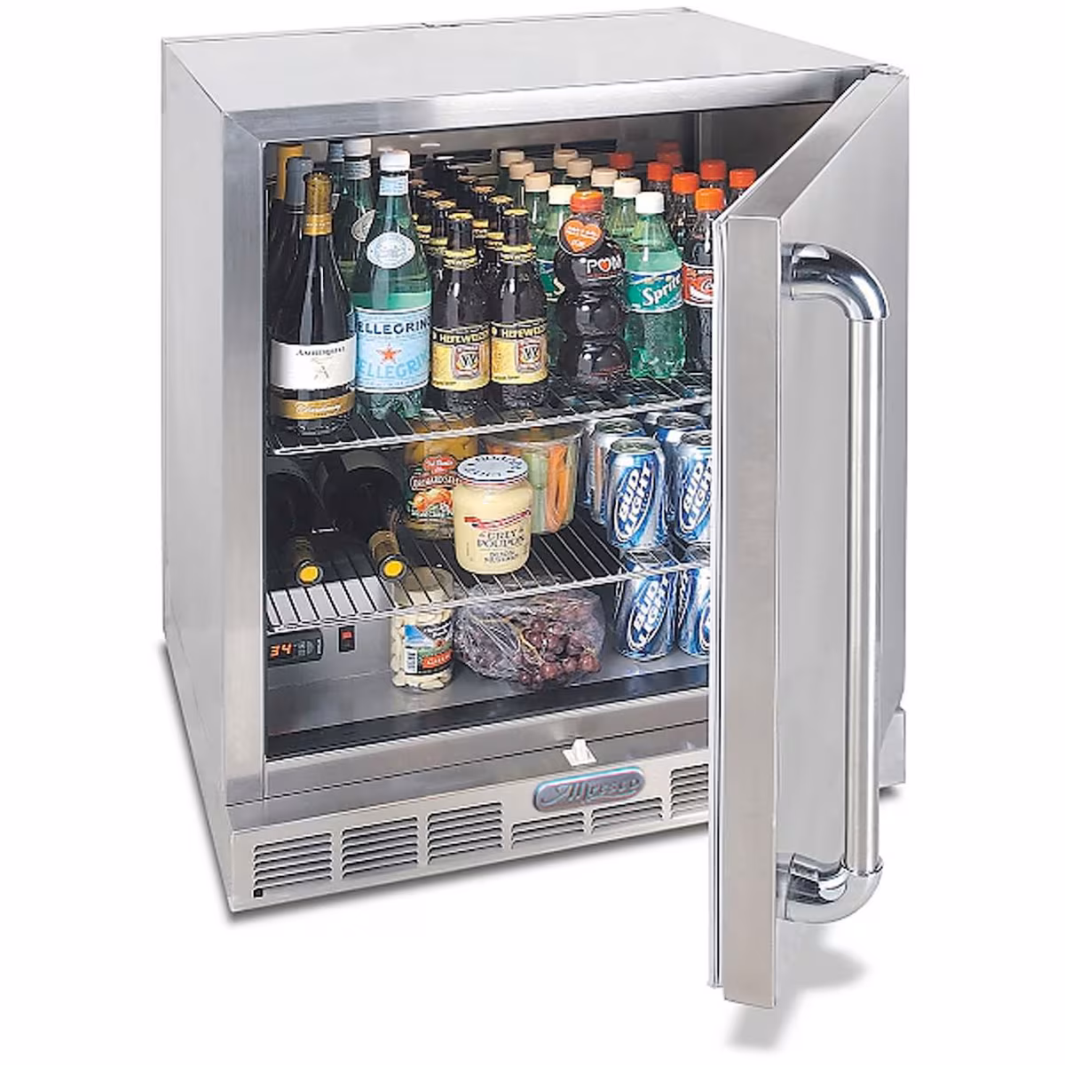 This Alfresco Refrigerator is a true all-weather refrigerator, performing even in extreme high and low temperatures. This refrigerator features an all-welded commercial stainless steel construction, 7. 25 cubic feet of interior storage space with adjustable wire shelves and high-velocity, fan-operated evaporator. The programmable digital thermostat allows you to set the temperature from 27 to 56 degrees Fahrenheit and has auto-defrost. This refrigerator is the epitome of versatility as it can convert from a refrigerator to a kegerator with the optional keg kit, and it can easily be converted back to refrigerator if you change your mind. It has two adjustable shelves and the door is reversible as well.