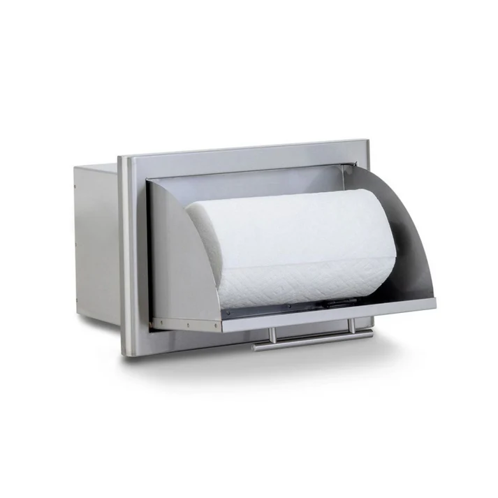 This Blaze paper towel holder features commercial grade 304 stainless steel construction to withstand outdoor elements and a unique completely rounded bevel design that enhances strength and durability. Conveniently store paper towels for easy access by simply pulling the door open. This quality outdoor kitchen paper towel holder is accented with a stylish straight handle. Blaze paper towel holders are the perfect storage solution for any outdoor kitchen! Physical Opening Dimensions(In Inches): 13 1/2 W
